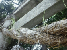 浮島神社の鳥居に地域の方が奉納してくれたしめ縄をかけております。この大雨でかつてないほど水が滲み込みぐっちょぐちょでした。ところが、そこに芽がでてきました。当初「雑草だろう」と思っていましたが、どうみても“稲”でした。