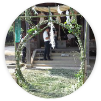 大きな神社の茅の輪と比べると貧弱に見えますが、理由があります。64本の茅で作っております。さらに、結び目も64か所。呪術をかけています。