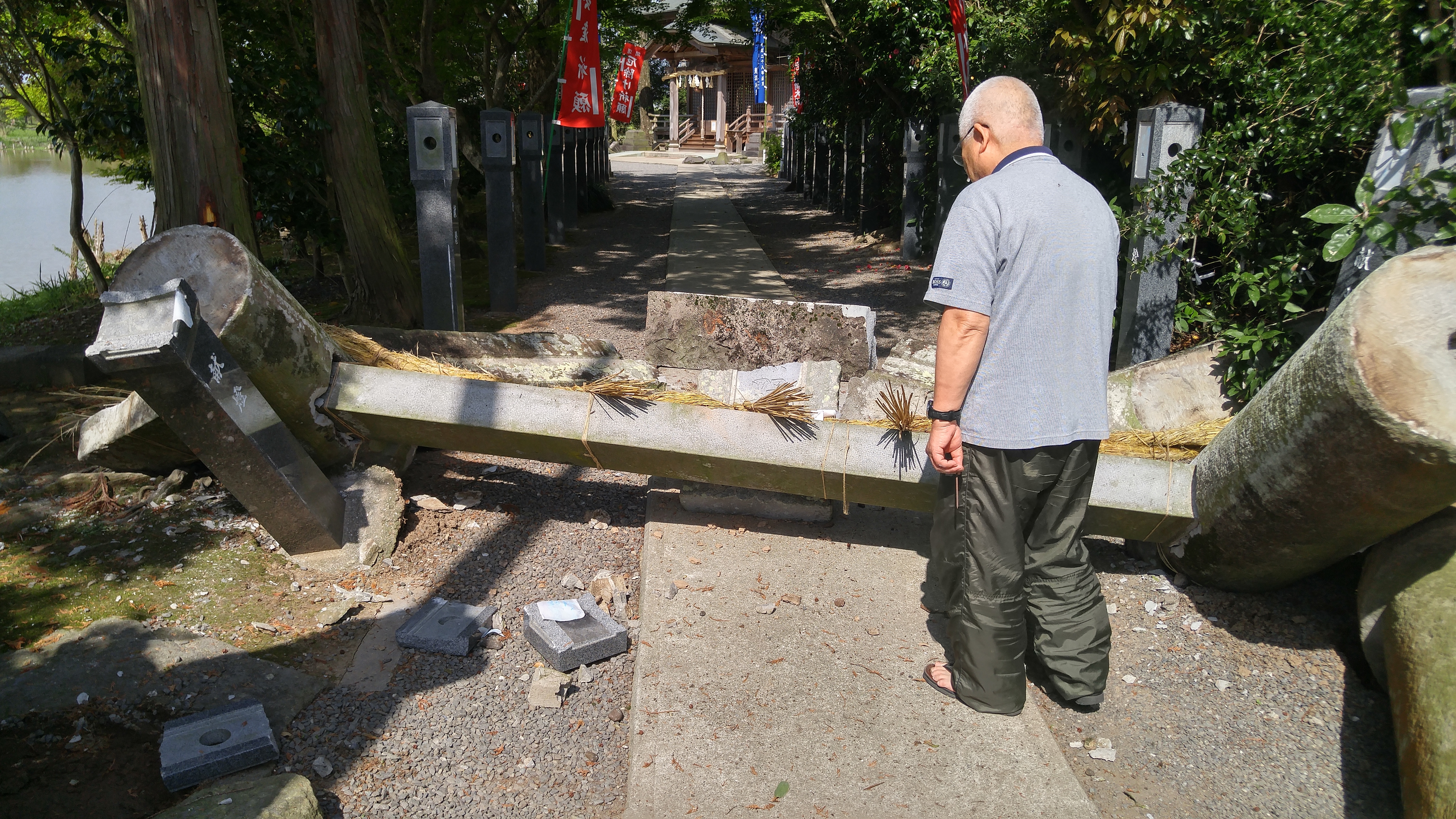前震は灯籠が倒れるぐらいでしたが、本震で鳥居、地割れ、社殿、本殿の傾き、社務所の歪み、瓦の崩壊、雨漏り等の被害を受けました。